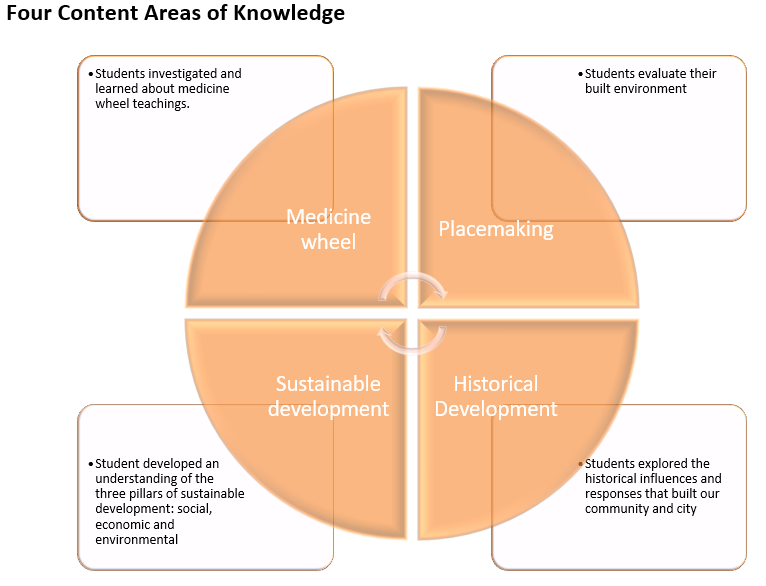 We were imagining and planning for learning that centers the person in an experience that is mental, physical, emotional and spiritual. While discussing our approach to the broad learning goal of “building place”, colleague Kale Bonham exclaimed – that is the medicine wheel! Our project-based learning design began to take shape. We approached the teachings from the medicine wheel as geographic physical place, and as a guide to a life of balance. The emphasis on balance assisted the learners in developing their analytical and decision making skills while working to complete our project centered on ‘building place.’